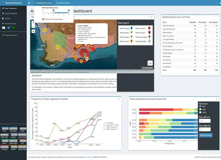 As part of this project, I developed and implemented the Ascochyta Dashboard – an interactive online dashboard that provides tabular and visual summary of the data collected and generated within the project, to allow research partners and industry to develop data-driven informed disease management strategies